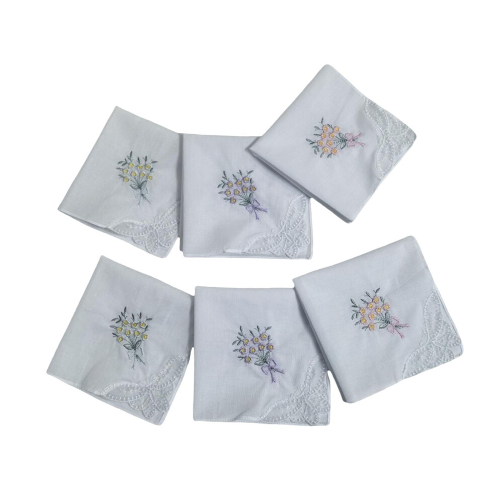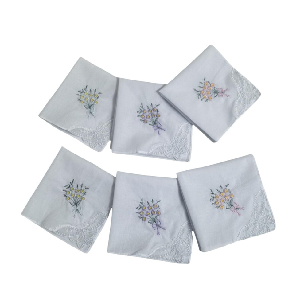 Apausvcm 6Pcs Ladies Handkerchiefs, Cotton Embroidered Handkerchief for Women Vintage Floral Hankies with Lace Edge White Soft Lace Handkerchiefs for Wedding Party