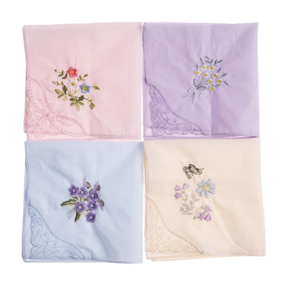 4Pcs Cotton Ladies Floral Handkerchiefs, Vintage Floral Style Lace Edging, Embroidery Women's Flower Hanky for Wedding Party, 28 cm/11 in