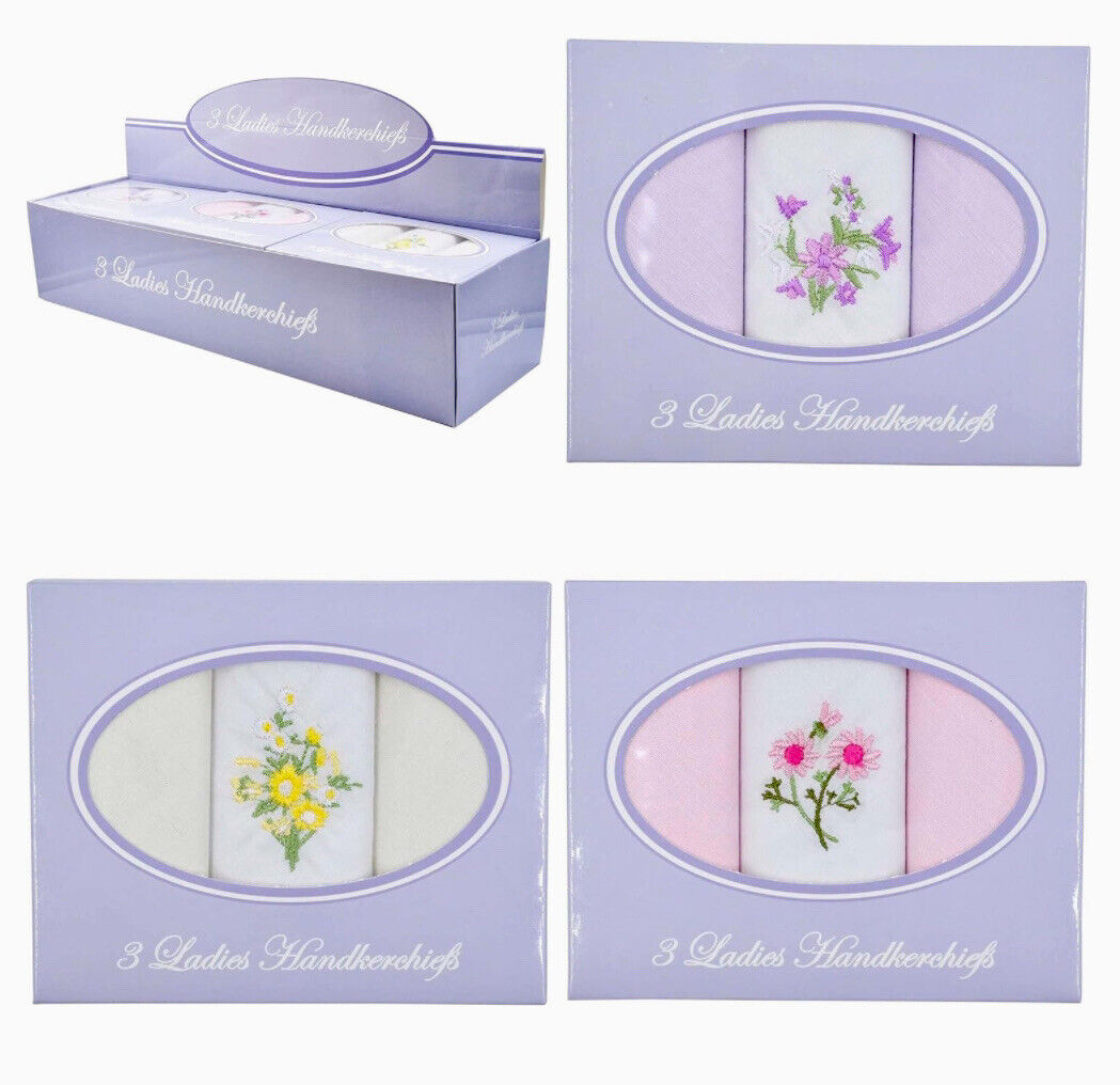 Ladies Embroidered White Handkerchiefs 100% Cotton Flower Herb Design 3 Pack