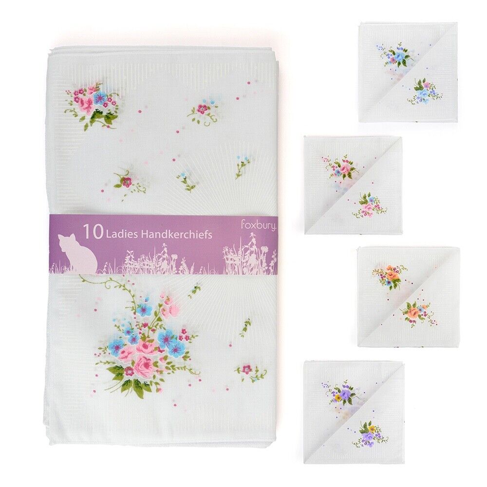 Ladies White Floral Hankies Handkerchiefs Cotton Polyester 10 Pack