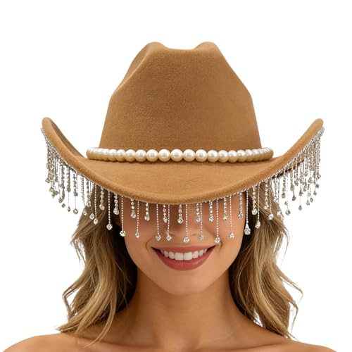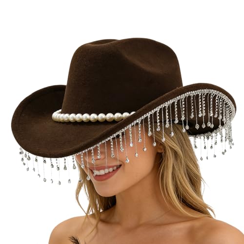 Cowboy Hat For Men Women - Rhinestone Cowboy Hat | Fashion Sparkly Wide Brim | Rhinestone Western Hats With Pearl | For Adult Ladies Girls Party Festival Carnival Concert Weddings