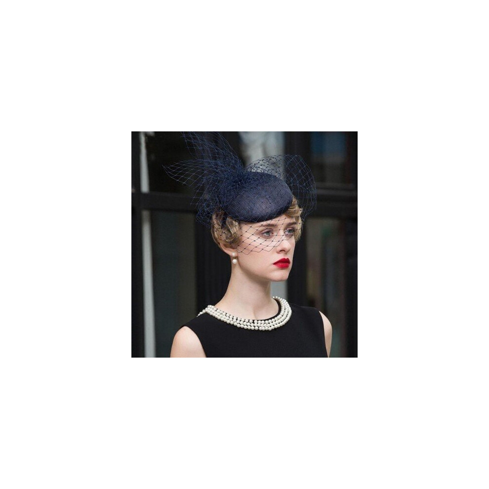 (Dark Blue Fascinator) FS Sinamay Blue Fascinators For Weddings Hats Women Tea Party Hat Derby Church With Veil Elegant Ladies Linen Pillbox Fedoras