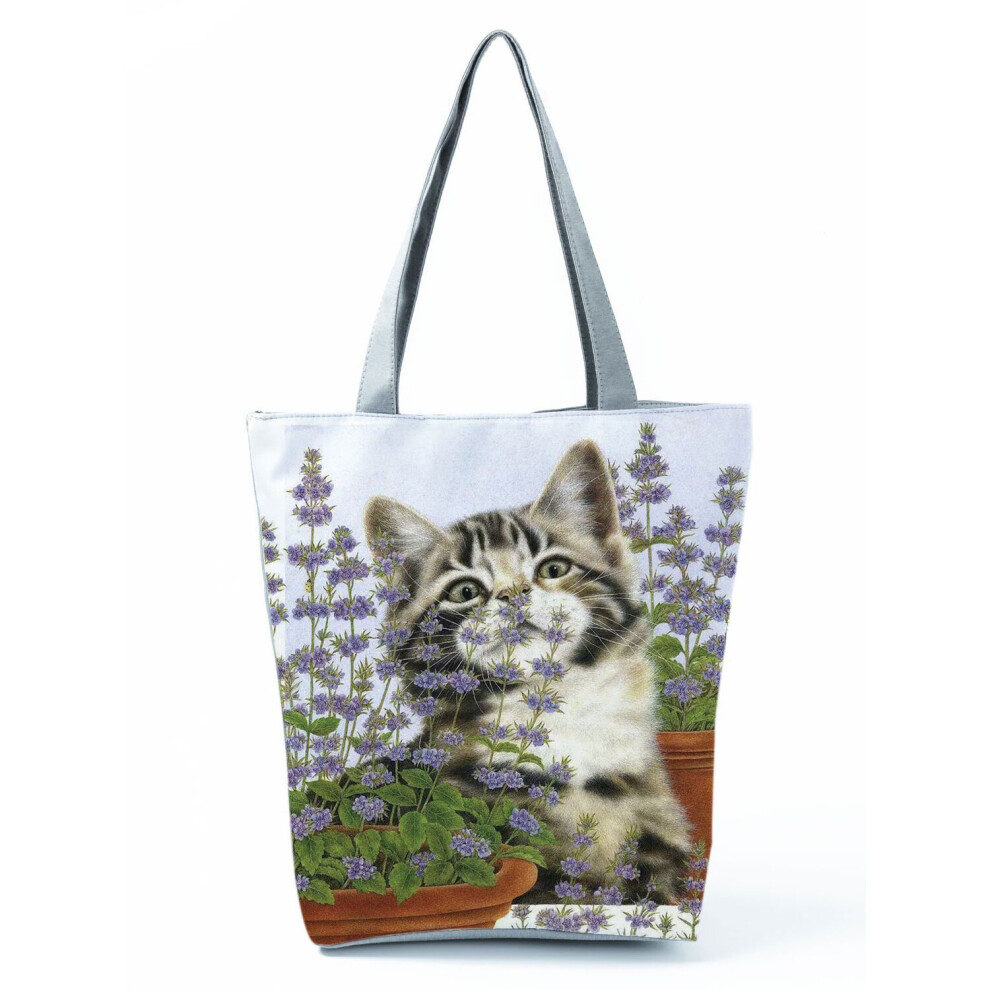 Cat Flower Painting Print Women Tote Bag Floral Ladies Handbags Large Shopping Bag Foldable For Groceries Portable