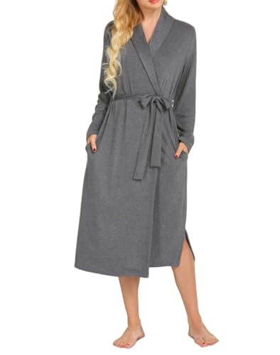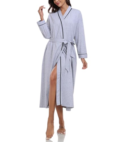 COLORFULLEAF Womens Dressing Gown Long 100% Cotton Kimono Robe Lightweight Ladies Bathrobe V Neck Soft Spa&Hotel Nightwear with Pockets for All Seasons(Grey,S)