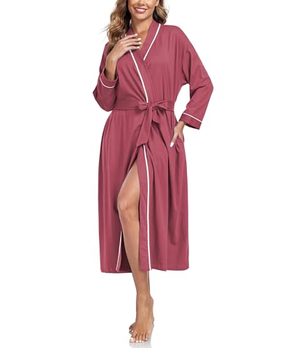 COLORFULLEAF Womens Dressing Gown Long 100% Cotton Kimono Robe Lightweight Ladies Bathrobe V Neck Soft Spa&Hotel Nightwear with Pockets for All Seasons(Purplish Red,M)