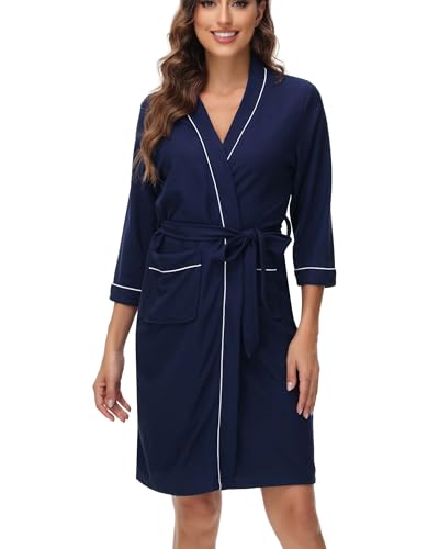 PrinStory Dressing Gown For Women Lightweight 3/4 Sleeve V Neck Long Kimono Robes Ladies Bathrobe Soft Sleepwear Loungewear (Navy Blue, M)
