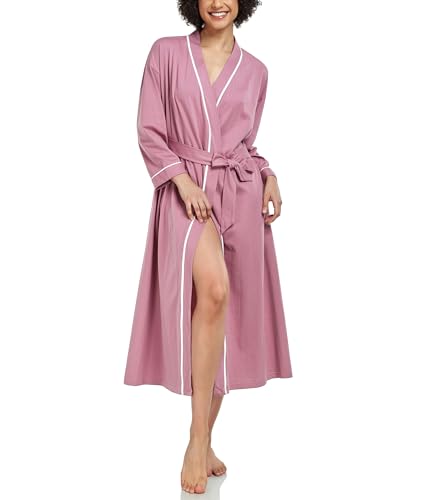COLORFULLEAF Womens Dressing Gown Long 100% Cotton Kimono Robe Lightweight Ladies Bathrobe V Neck Soft Spa&Hotel Nightwear with Pockets for All Seasons(Dusty Rose,2XL)