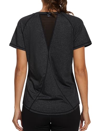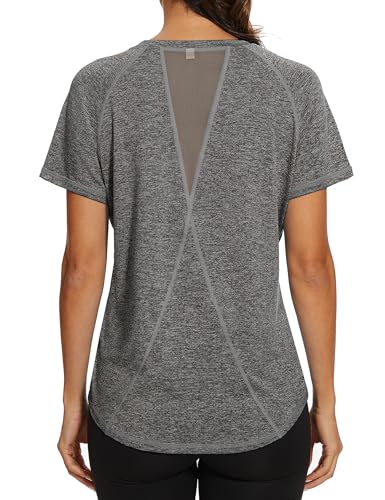 Gyabnw Ladies Gym Tops Women Short Sleeve Casual Workout Yoga Running Top Crew Neck Back Mesh Fitness Athletic Tee Shirts Dark Grey
