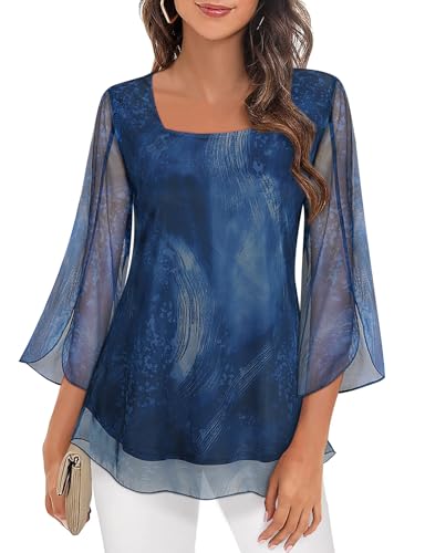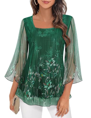 Syphiby Blouses For Women, Womens 3/4 Sleeve Square Neck Tunic Tops Ladies Floral Chiffon Blouse Ladies Flowy Mesh Blouse