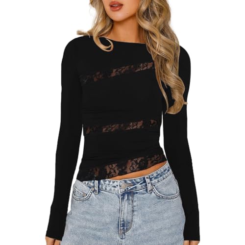 EMOTTOS Women's Sexy Lace Tops, Y2K Patchwork Long Sleeve Mesh T-Shirt, Ladies Slim Fit Round Neck Crop Tops, Sexy Irregular Top with Floral Lace for Club Streetwear, Black, M