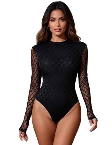 comeondear Womens Sexy Bodysuits Elegant Lace Black Bodysuit Mesh Long Sleeve Leotard Ladies Going Out Tops Bodysuit Jumpsuit Clubwear Tops