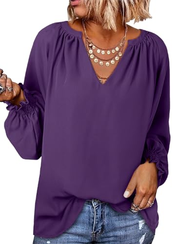 Dokotoo Womens Blouses Top Smocked Puff Long Sleeve Oversized Women's T-Shirts V Neck Women Spring Dressy Outfits Shirts Casual Chiffon Ladies Tunic Tops Purple 2XL UK 20 22