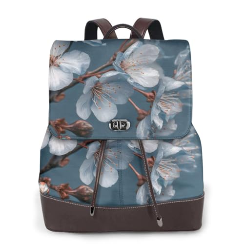 Blue Gray Cherry Blossom Print Leather Women's Backpack Travel Bag Ladies Versatile Small Backpack Business Leisure,One Size