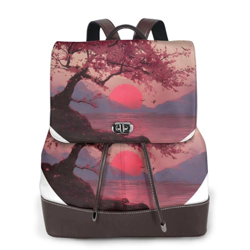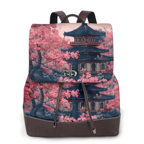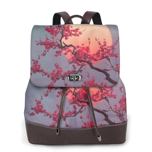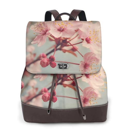 Japanese Style Cherry Blossoms Print Leather Women's Backpack Travel Bag Ladies Versatile Small Backpack Business Leisure,One Size
