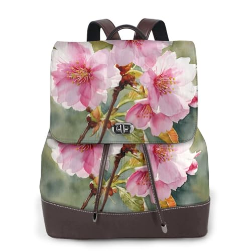 Watercolor Cherry Blossoms Print Leather Women's Backpack Travel Bag Ladies Versatile Small Backpack Business Leisure,One Size