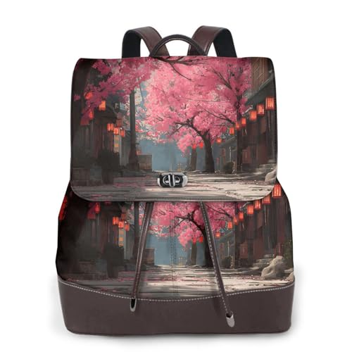 Cherry Blossom Lantern Print Leather Women's Backpack Travel Bag Ladies Versatile Small Backpack Business Leisure,One Size