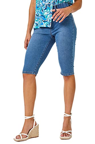 Roman Originals Knee Length Jeggings for Women Ladies Stretch Denim Shorts Jeans Cropped Trouser Capri Pants Summer Cotton Legging Pedal Pusher Legged Crop Spring Cutoff Work - Denim - Size 16