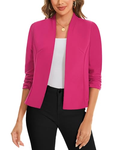 LADI TREND Ladies Hot Pink Open Front Blazers 3/4 Sleeve Cardigan Washable Business Summer Lightweight Jackets Night Out Dress Top Outerwear Anniversaries (Hot Pink L)