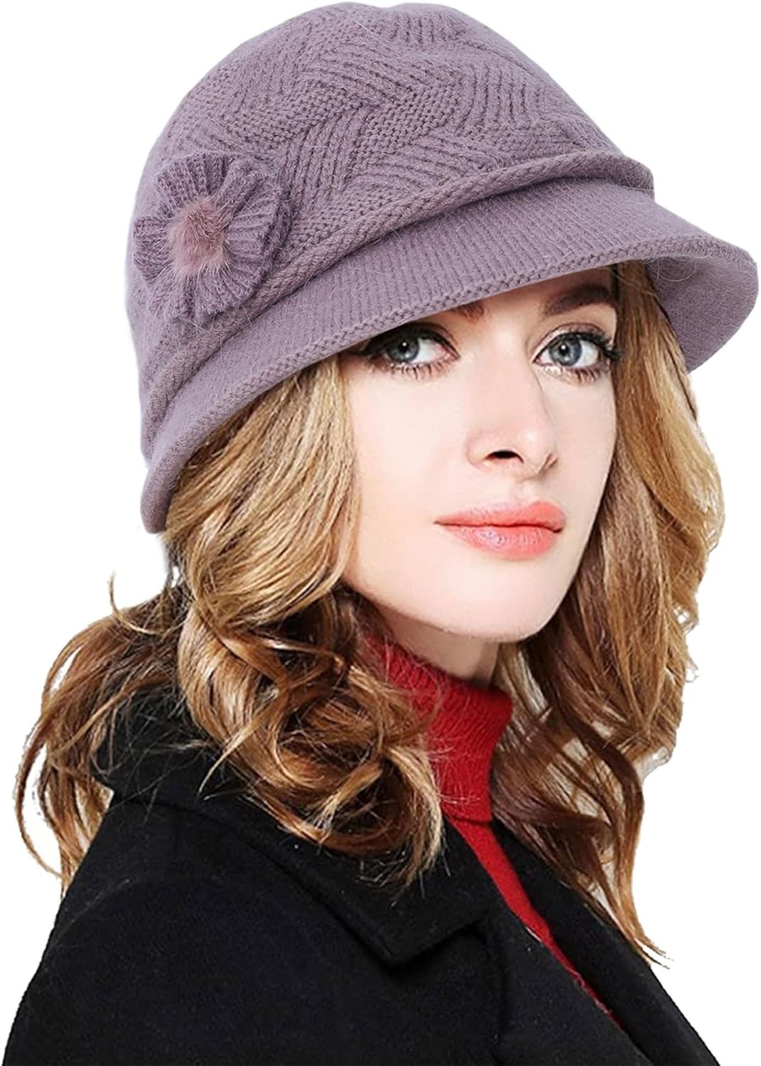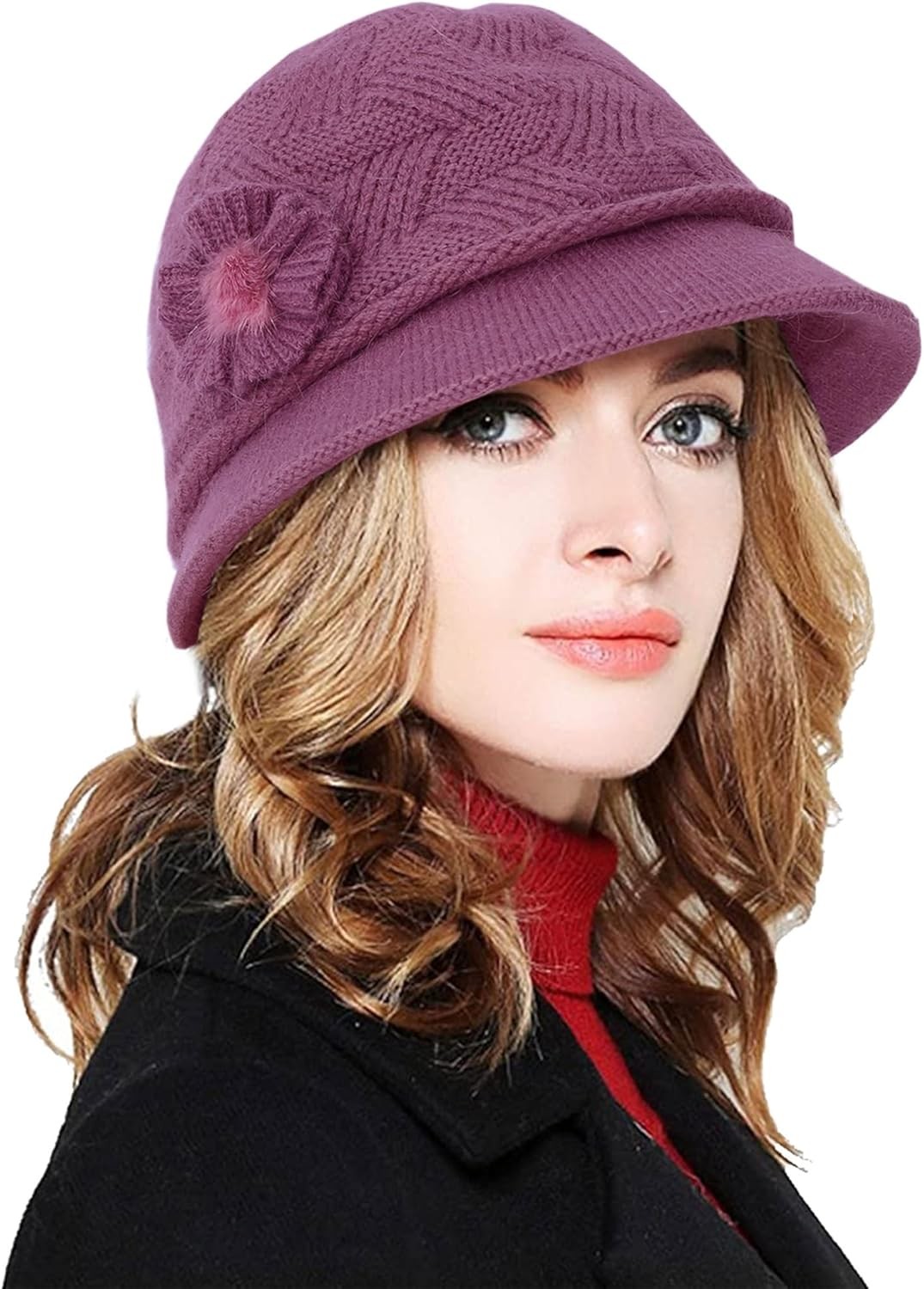 Beanie Hats for Women - Knitted Winter Hat Fleece Lined Ladies Beret Hat Warm Knitted Wool Hat Peaked Baker Boy Hat with Visor Pink Purple