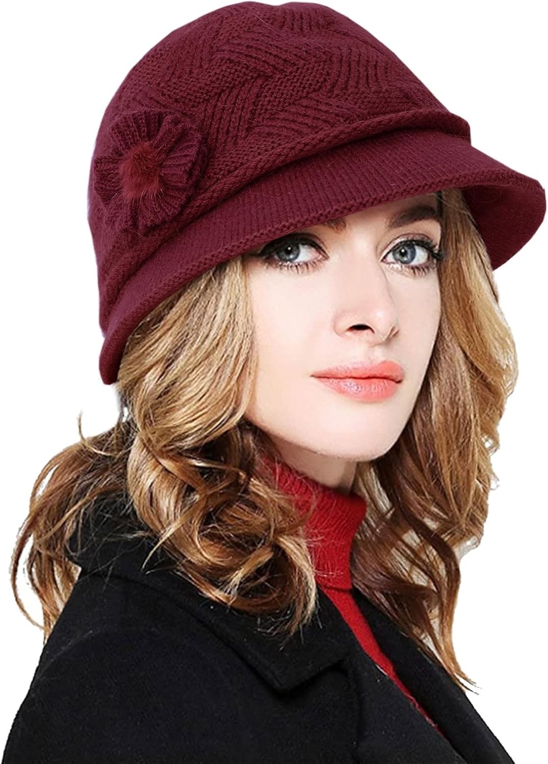 HshDUti Beanie Hats for Women, Boho Floral Printed Winter Hat Fleece Lined Ladies Beret Hat Warm Hat Peaked Baker Boy Hat with Visor Dark Gray One Size