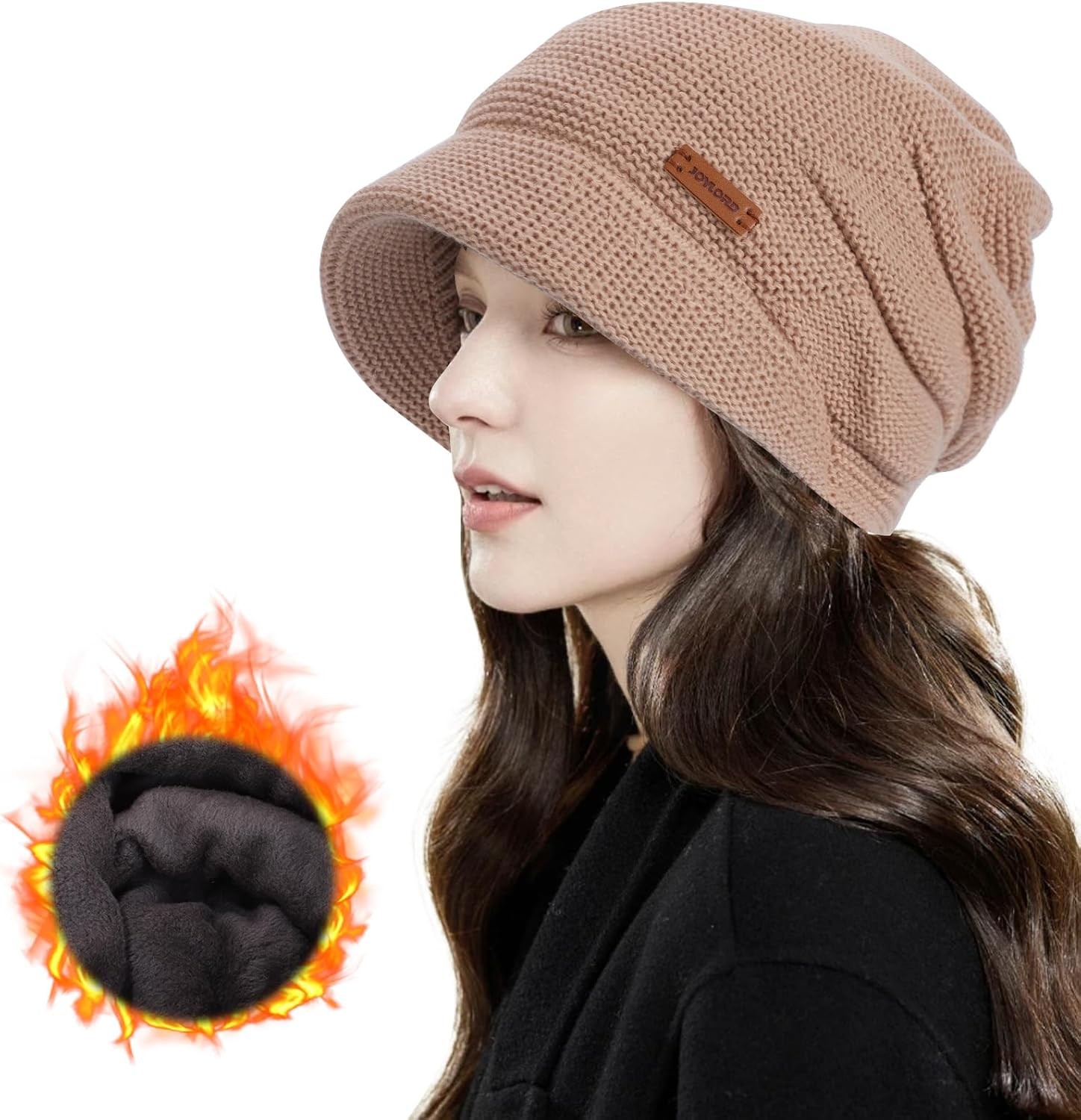 Beanie Hats for Women - Knitted Winter Hat Fleece Lined Ladies Beret Hat Warm Knitted Wool Hat Peaked Baker Boy Hat with Visor Black