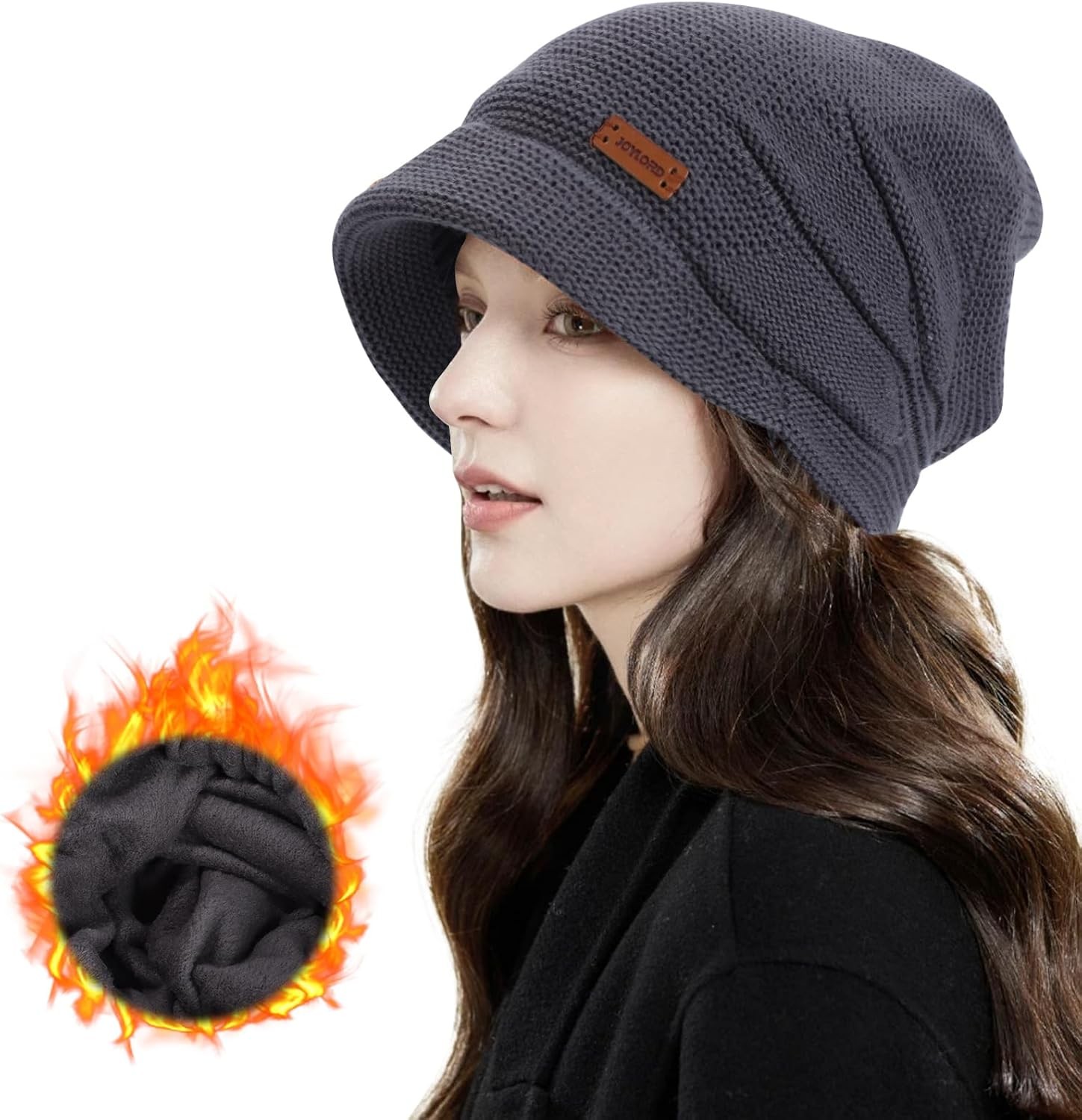 Beanie Hats for Women - Knitted Winter Hat Fleece Lined Ladies Beret Hat Warm Knitted Wool Hat Peaked Baker Boy Hat with Visor Light Gray