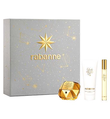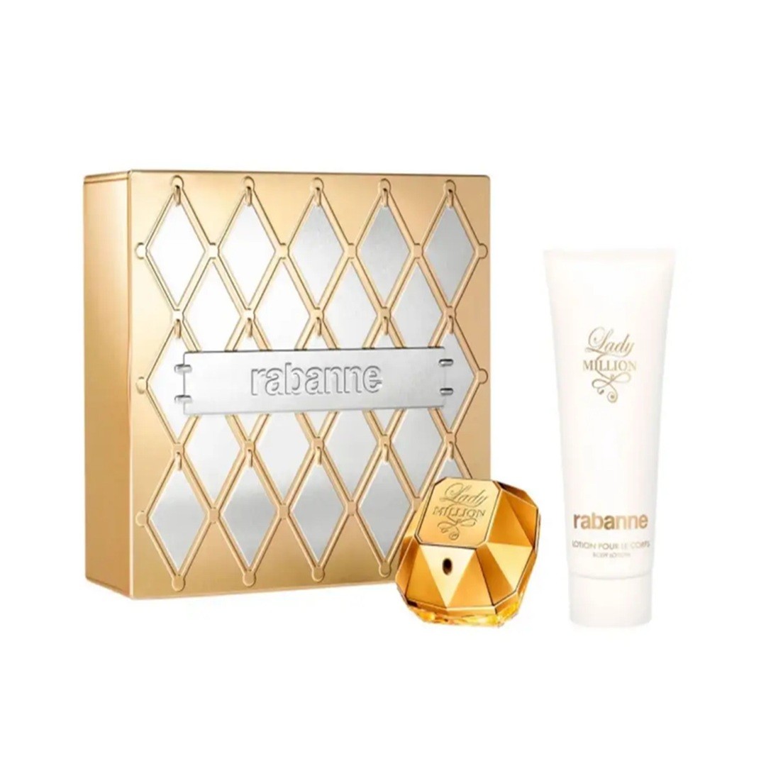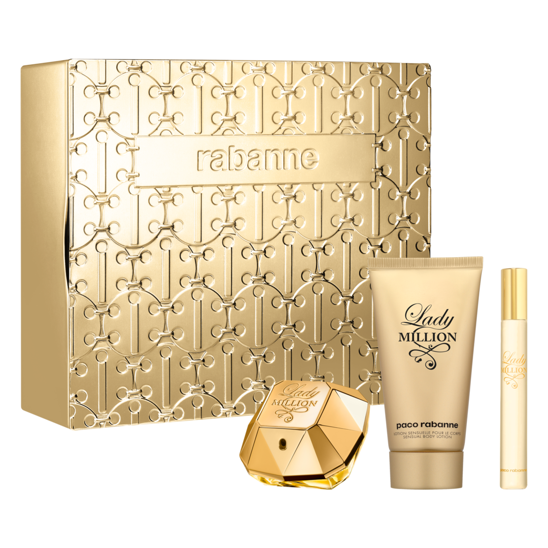 Explore our collection of Lady Million perfume gift sets. Compare prices and discover the perfect gift for her. Our selection includes the Paco Rabanne Lady Million edp 50ml + BL 75ml for Women set, the Paco Rabanne Lady Million Gift Set with EdP 50ml and body lotion 75ml, and the Rabanne Lady Million Eau de Parfum & Body Lotion Gift Set. Find the ideal present and take advantage of our price comparison features today.