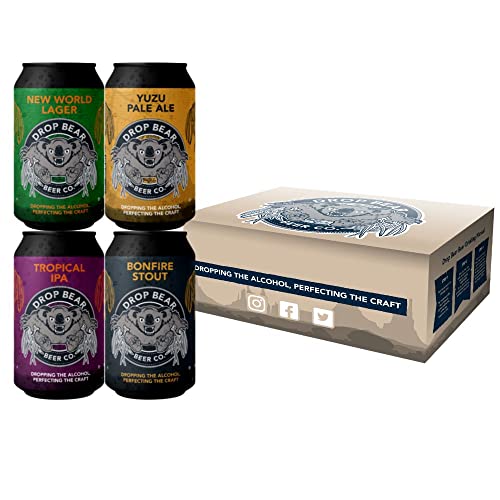 Drop Bear Beer Co. Alcohol Free Beer - Mixed Case: Lager, Pale Ale, IPA, Stout - Case of 12 x 330ml, 0.5% cans | Vegan, Gluten Free | Non Alcoholic Gifts & Hampers