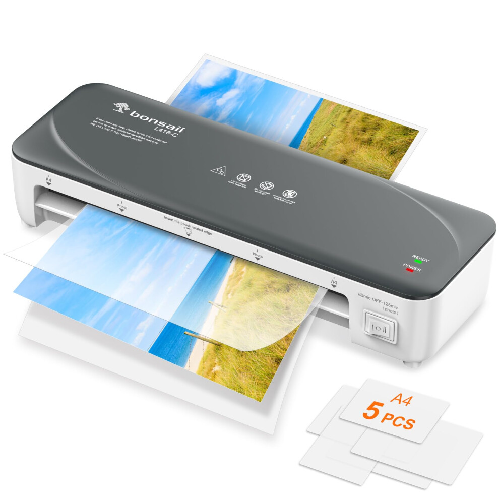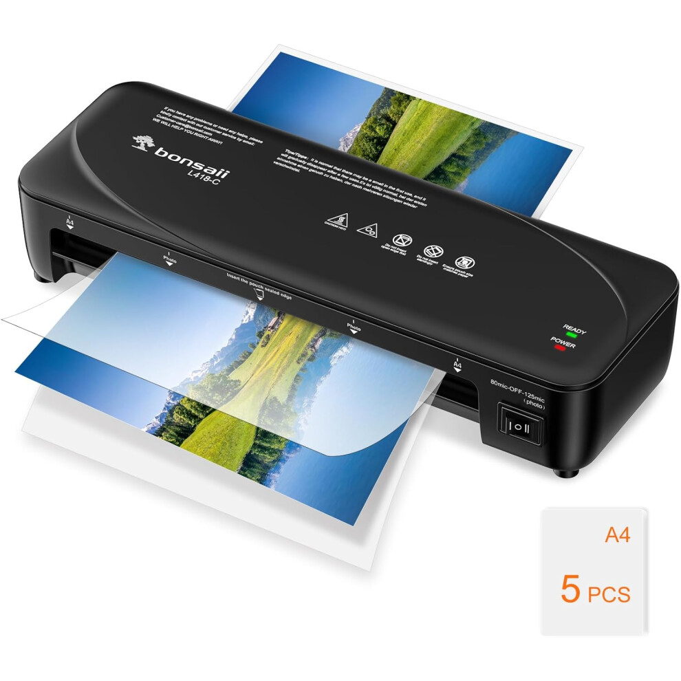 Bonsaii A4 Laminator Machine Set - Includes 50 Laminating Pouches (30xA4, 10xA5, 10xA6), with Never Jam Technology, Dual Heat Settings, High-Speed Laminating, Max A4 Size Width, Black, L418-C