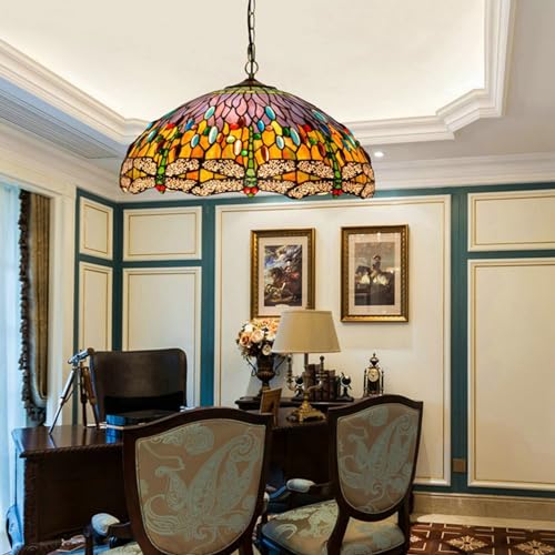 XANAYXWJ 20 inch Hanging Pendant Lamp Style Stained Glass Lamp Shades Vintage Christmas Home Decor Pendant Light 3 Light chandelier for Kitchen Dining Room living room Ceiling Light,Dragonfly A