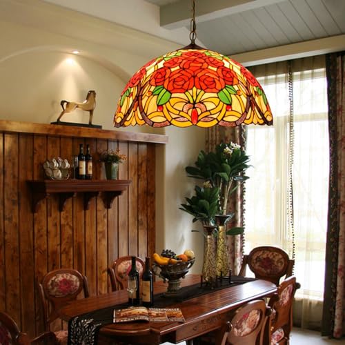 XANAYXWJ 20 inch Hanging Pendant Lamp Style Stained Glass Lamp Shades Vintage Christmas Home Decor Pendant Light 3 Light chandelier for Kitchen Dining Room living room Ceiling Light,Rose