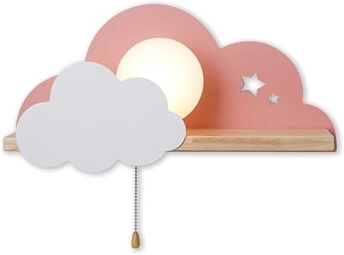 FLXHSA Lovely Cloud Shape Indoor Wall Light Children's Room Lamp with Rubber Wood Shelf and Pull(Pink)