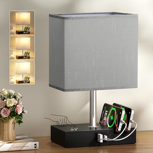 Totofac Touch Bedside Table Lamp, Touch Control Table Lamp with USB-C&USB-A Charging Ports, Lamps 3 Way Dimmable, Small Lamp Grey Flaxen Fabric Shade for Bedroom,Dimmable Bulb Included