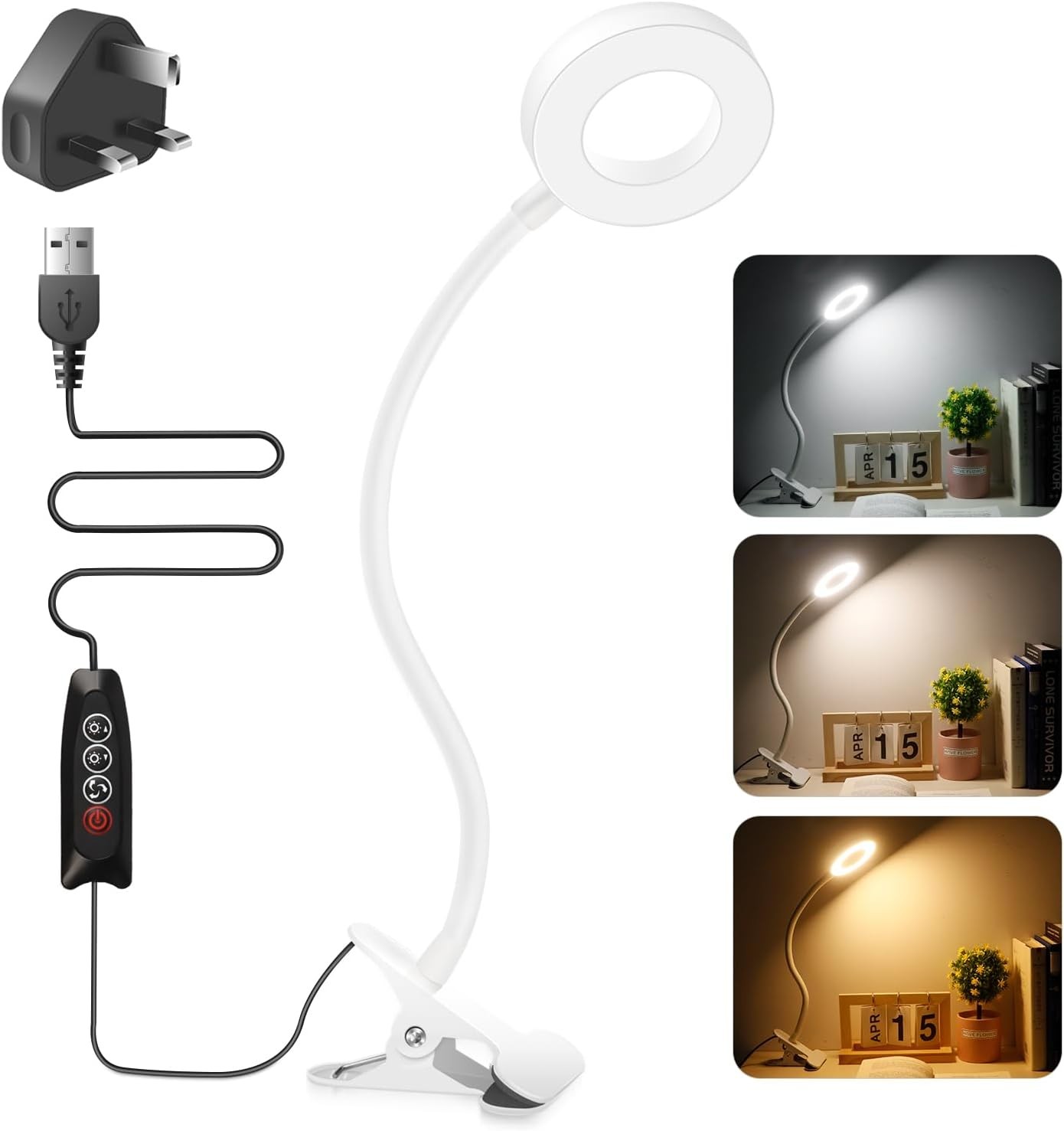 Akynite 8W Reading Lamp Clip On Bed, Flexible USB Desk Lamp with Cable, 3 Colour Changing & 10 Brightness, Bedside Reading Lamp, Clip Desk Light for