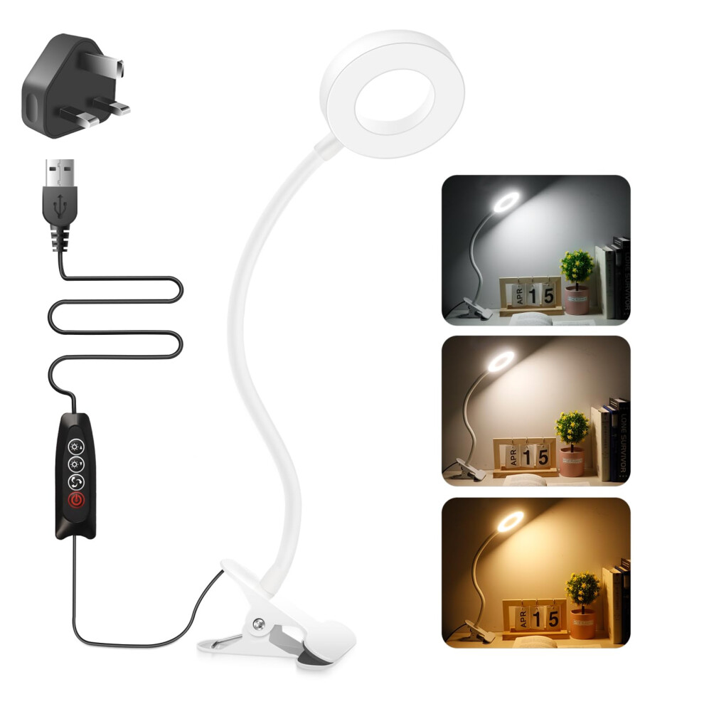 Woputne Desk Clip on Lamp for Reading Office, with 5V 2A Adapter, 10 Dimmable Brightness 3 Modes, Clamp Light for Bed Headboard, Bedside, Craft, (White)