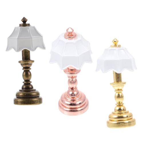HEMOTON 3pcs Miniature LED Desk Lamps for Dollhouse Decor, Micro Landscape Bedside Lamps with White Shades in Gold, Rose Gold, and Brown Bases, Mini House Desktop Lighting Accessories