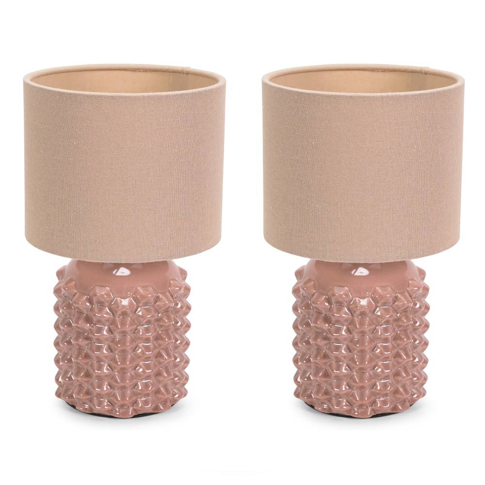 ValueLights Asha Pair of Ceramic Pink Geometric Table Lamps with Drum Shades and LED Bulbs in Natural
