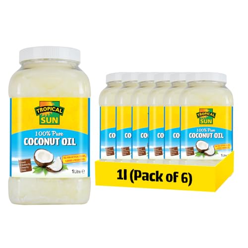 Tropical Sun 100% Pure Coconut Oil, Cold-Pressed,1L (Pack Of 6), Premium Natural Cooking & Beauty Oil, Unrefined, Ideal for Baking, Frying, Skin & Hair Moisturizer, Gluten-Free, Vegan
