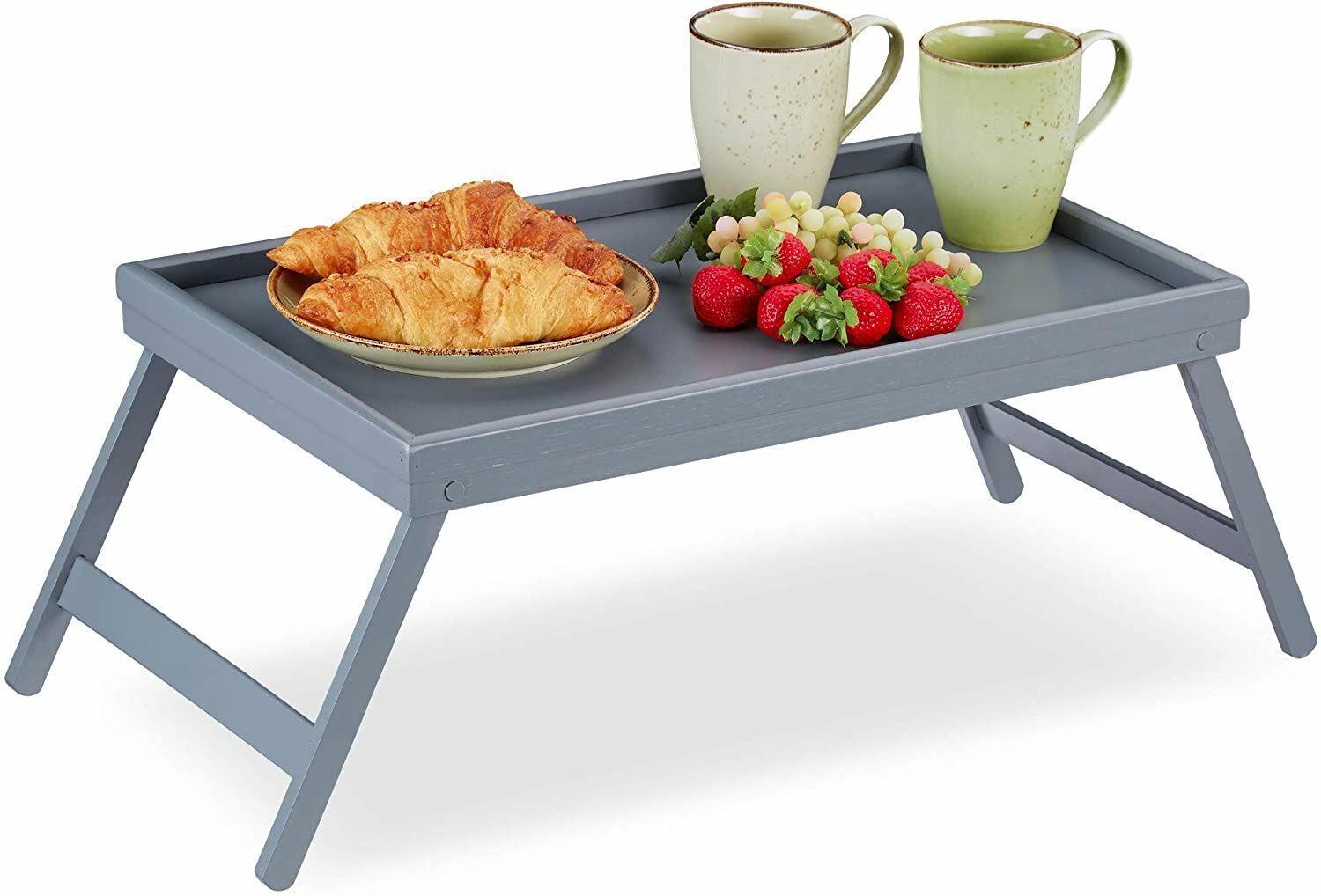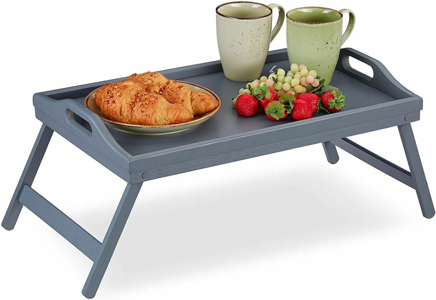 GREY BAMBOO WOODEN BREAKFAST SERVING LAP TRAY BED TABLE WITH FOLDING LEGS
