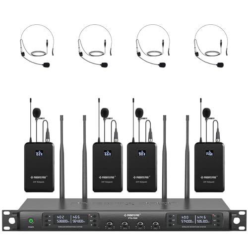 Phenyx Pro Wireless Microphone System, UHF 4-Channel Wireless Mic Set w/ 4 Bodypacks, Headsets/Lapel Mics, 4x40 Frequencies, Auto Scan, 328ft Coverage, Microphone for Singing, DJ, Church(PTU-7000-4B)