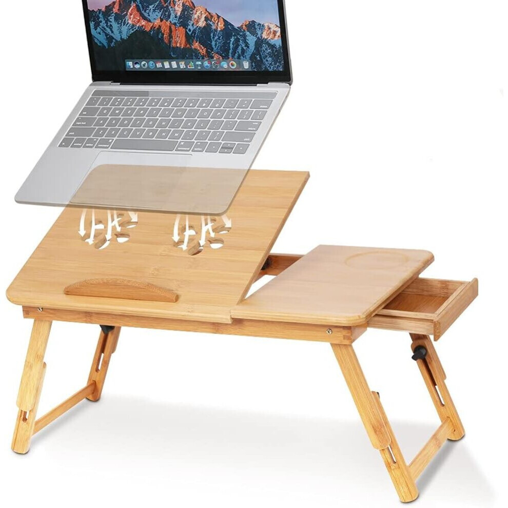 Bamboo Adjustable Laptop Tray, Portable Folding Laptop Table with Drawer and Cooling Holes, Sofa Bed Working Lunch Tray