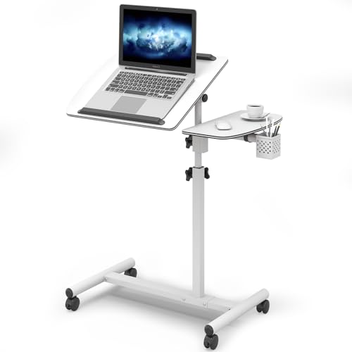 Warmiehomy Height Adjustable Computer Desk on Wheels, Rolling Laptop Desk with Cooling Fan, Overbed Table with Mouse Tray, Laptop Table with Pen Holder, Bedside Table for Home Office, White