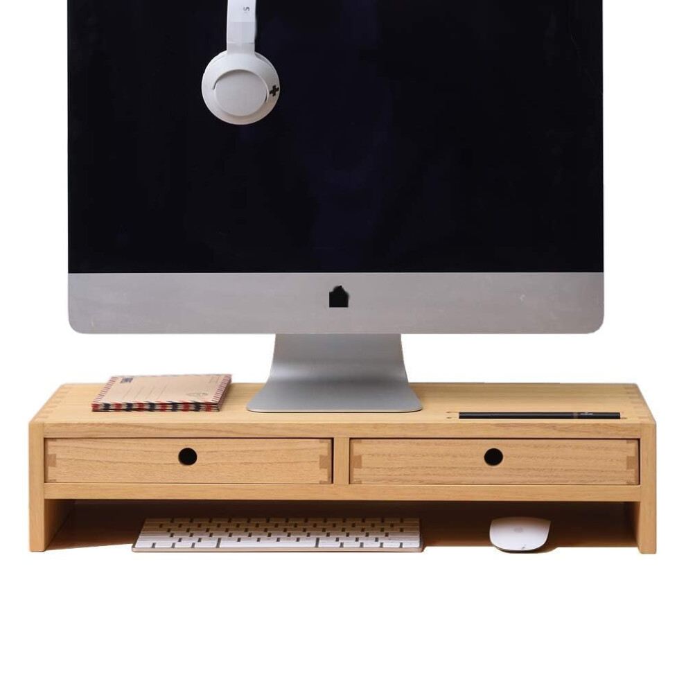KIRIGEN Wood Monitor Stand with 2 Drawers Computer Arm Riser Desk Storage Organizer, TV Laptop Printer Stand,2-Tier Desktop Shelf Natural