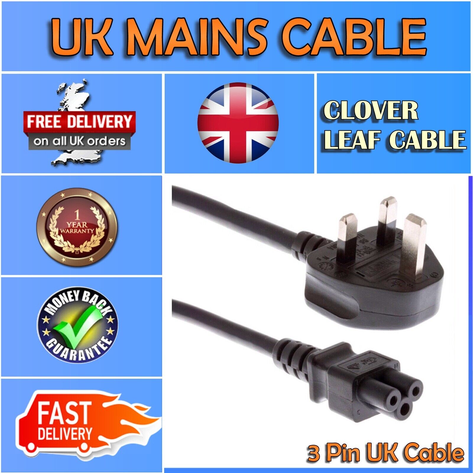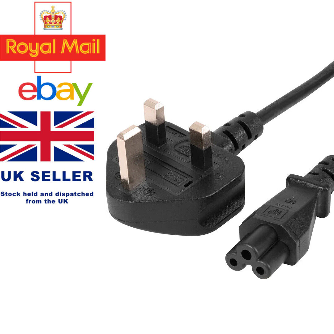 Mains Cable UK Plug 3Pin Laptop Adapters Chargers Power Lead C5 Cloverleaf Cable