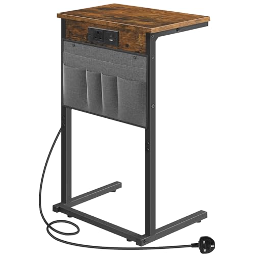 HOOBRO C Shaped Side Table, Bedside Table with Charging Station, Slim Sofa Side Table with Storage Bag, Small Table Laptop Tables with Metal Frame Coffee Table for Small Space, Rustic Brown EBF70KSF01