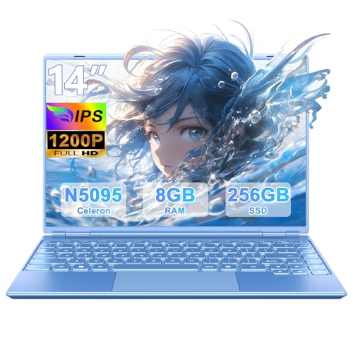 HUQPPQ 14 Inch Laptop 8GB RAM 256GB SSD Celeron N5095 Processor, FHD 1920×1200 IPS Display, Blue Laptop with Webcam, WiFi 5, BT4.2, USB 3.0, Lightweight Laptops for Students, Work or Travel