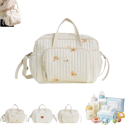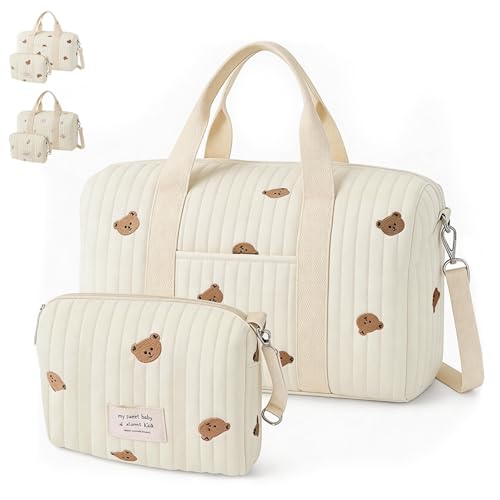 Miepkvl Large Baby Changing & Hospital Maternity Bag, Embroidery Changing Bag Tote, Large Diaper Bag Tote Bear & Flower Quilted Multifunctional Maternity Bags For Moms (A)