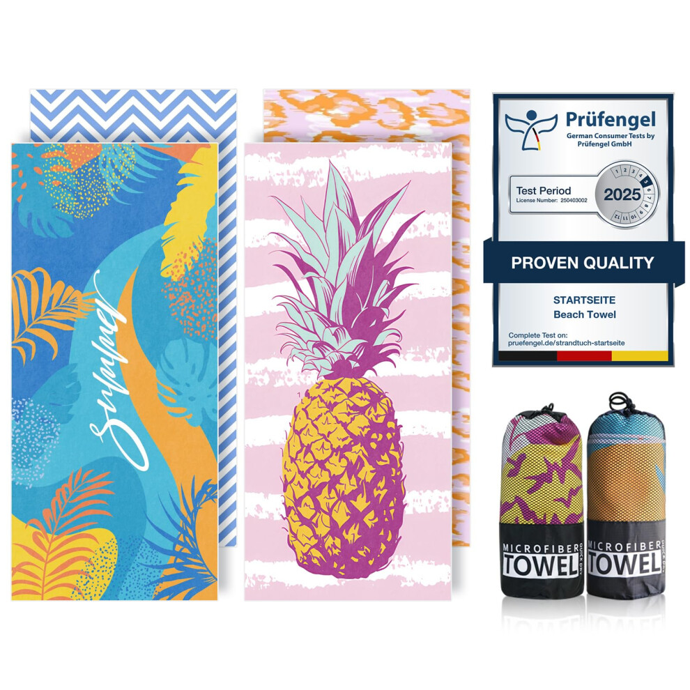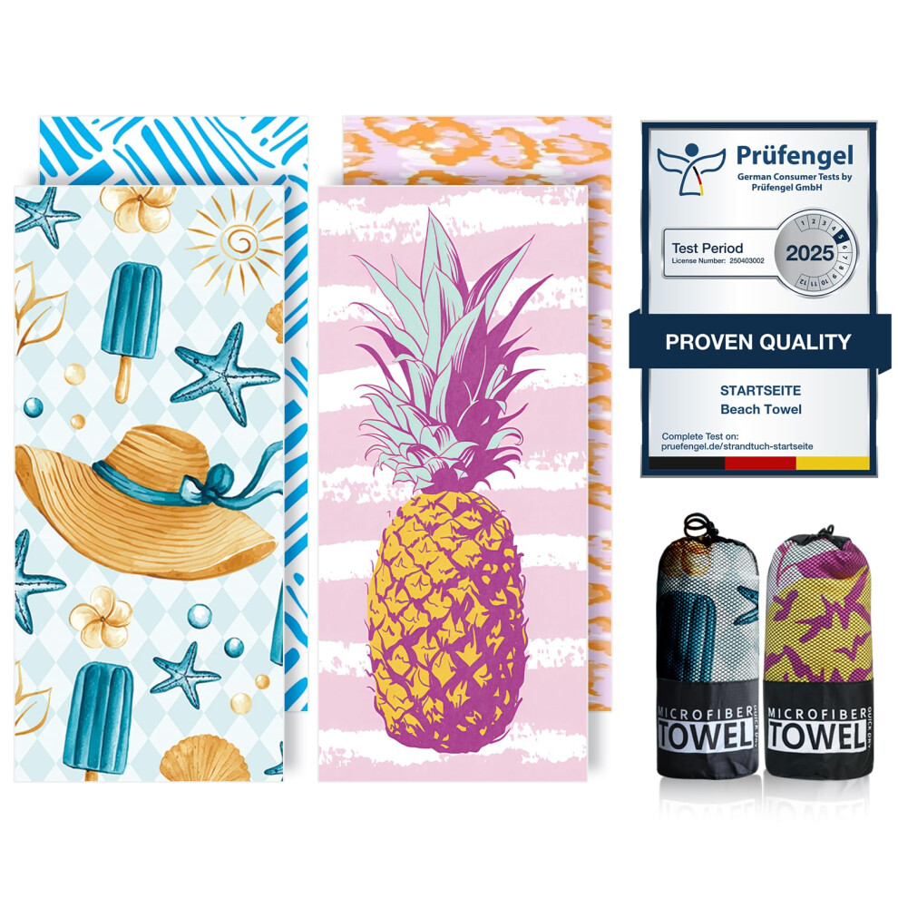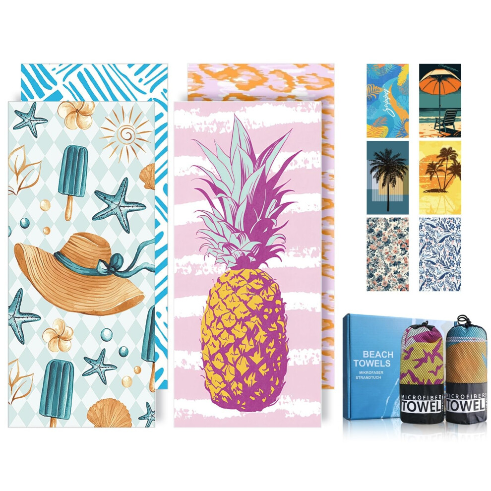 Microfibre Beach Towels for Adults - 200x90cm 2 Pack Extra Large Beach Towels in Gift Boxed, 250 GSM, Sand Free, Lightweight & Quick Dry Beach Towel for Swim, Travel and Gym(Word & Pineapple)