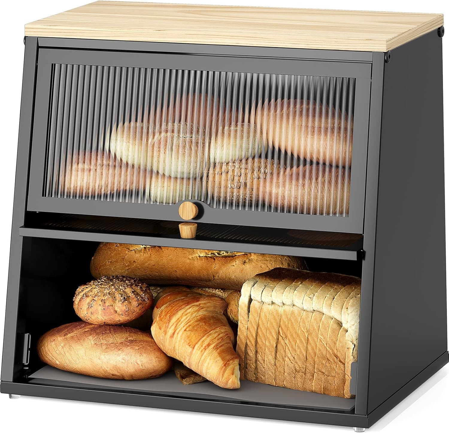HOMEKOKO Double Layer Large Bread Box for Kitchen Counter Wooden Large Capacity Bread Storage Bin (Black)