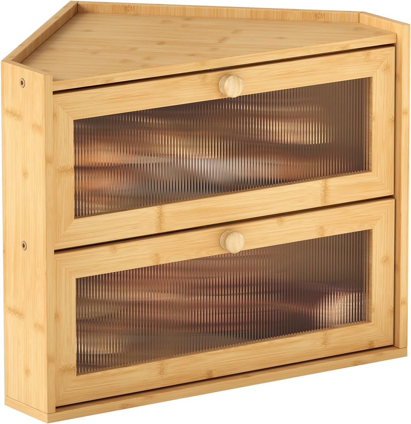 2 Tier Corner Bread Bin, Large Natural Bamboo Bread Box with Window for Kitchen